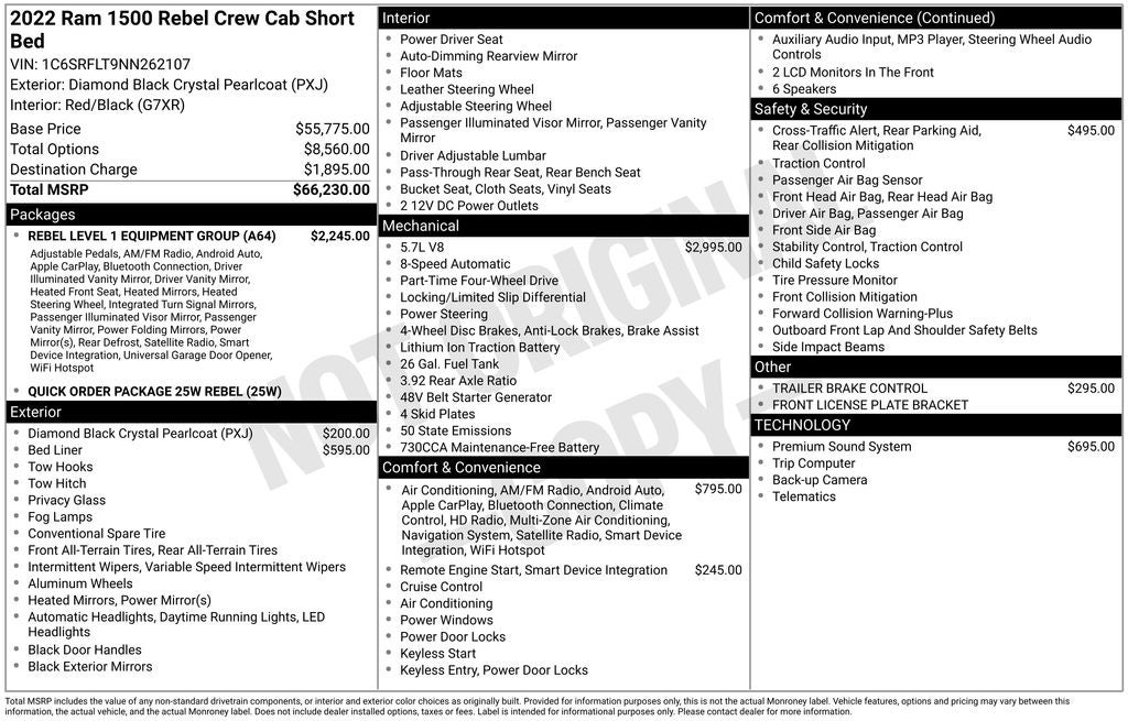 2022 Ram 1500 Rebel 4WD Odometer is 2744 miles below market average! ***Clean Carfax***, ***Heated Steering Wheel***, ***Heated Front Seats***, ***Rear View Camera***, ***Parking Sensors***, ***Bluetooth®***, ***Sirius XM Radio***, ***Apple Carplay/ Android Auto***, ***Remote Start***, ***Bed Liner***, ***Cloth / Vinyl LowBack Bucket Seats***.